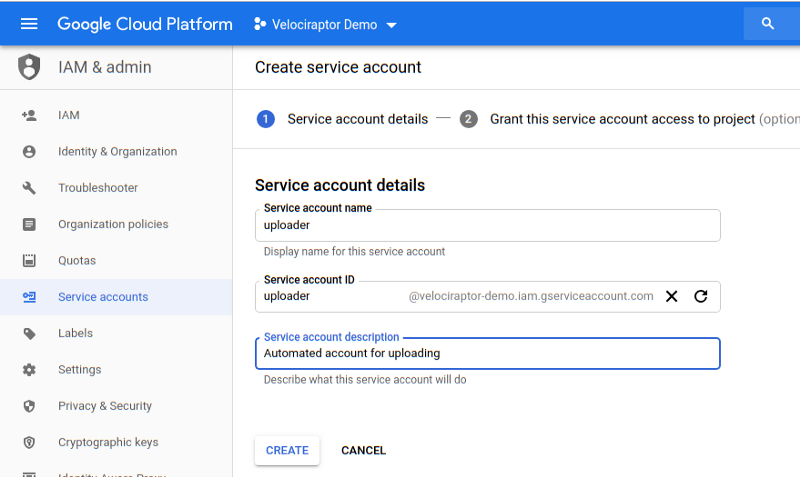 upload to our bucket. Go to IAM & Admin / Service Accounts / Create